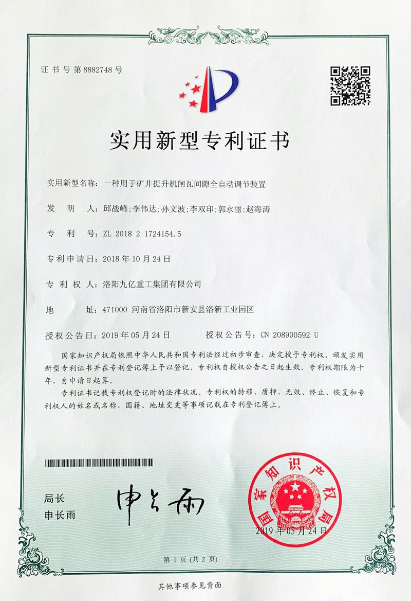 閘瓦間隙全自動(dòng)調節裝置證書(shū)